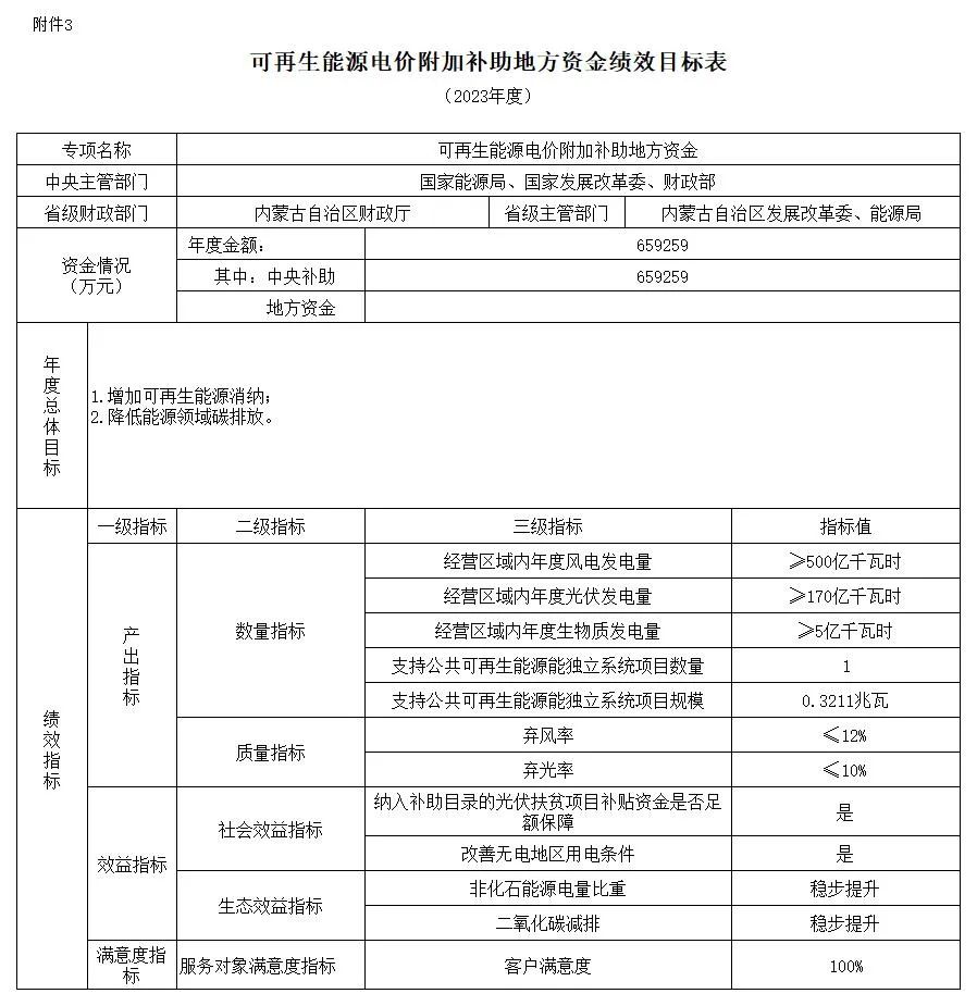 根據(jù)財(cái)政部會(huì)同有關(guān)部門(mén)印發(fā)的《關(guān)于印發(fā)<可再生能源電價(jià)附加資金管理辦法>的通知》(財(cái)建〔2020〕5號(hào),以下簡(jiǎn)稱《資金管理辦法》)、《關(guān)于<關(guān)于促進(jìn)非水可再生能源發(fā)電健康發(fā)展的若干意見(jiàn)>有關(guān)事項(xiàng)的補(bǔ)充通知》(財(cái)建〔2020〕426號(hào))等文件要求以及你單位申請(qǐng),現(xiàn)下達(dá)2023年度可再生能源電價(jià)附加補(bǔ)助資金預(yù)算。資金支付方式按照財(cái)政國(guó)庫(kù)集中支付有關(guān)制度執(zhí)行,具體金額見(jiàn)附件2。項(xiàng)目代碼和名稱為“10000017Z175060070001可再生能源電價(jià)附加補(bǔ)助地方資金”,收入列2023年政府性基金預(yù)算收入科目“1100407節(jié)能環(huán)保”,支出列2023年政府性基金預(yù)算支出功能分類科目“2116001風(fēng)力發(fā)電補(bǔ)助”、“2116002太陽(yáng)能發(fā)電補(bǔ)助”、“2116003生物質(zhì)能發(fā)電補(bǔ)助”,列2023年政府預(yù)算支出經(jīng)濟(jì)分類科目“50799其他對(duì)企業(yè)補(bǔ)助”。有關(guān)事項(xiàng)通知如下: