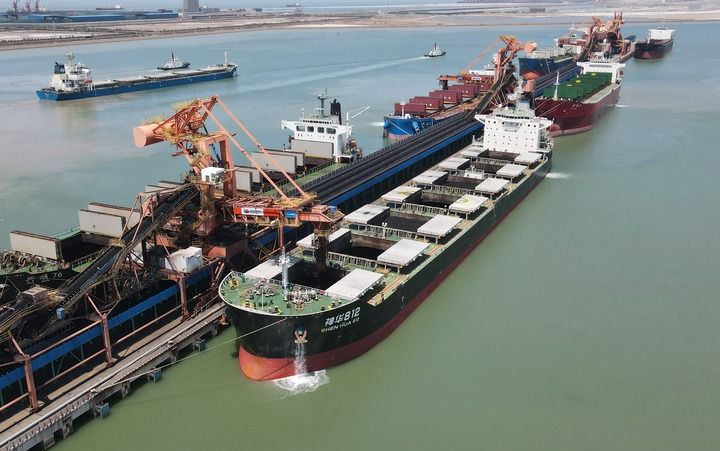 6月27日,船舶在黃驊港煤炭港區(qū)裝運電煤(無人機(jī)照片)。