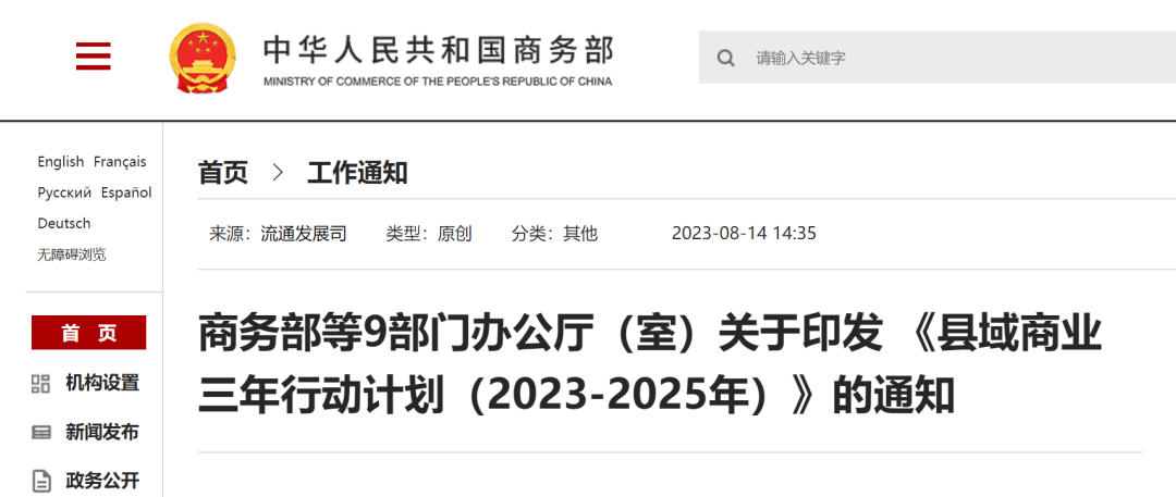 8月14日,商務(wù)部等9部門辦公廳(室)發(fā)布關(guān)于印發(fā) 《縣域商業(yè)三年行動(dòng)計(jì)劃(2023-2025年)》(以下簡(jiǎn)稱《計(jì)劃》)的通知。