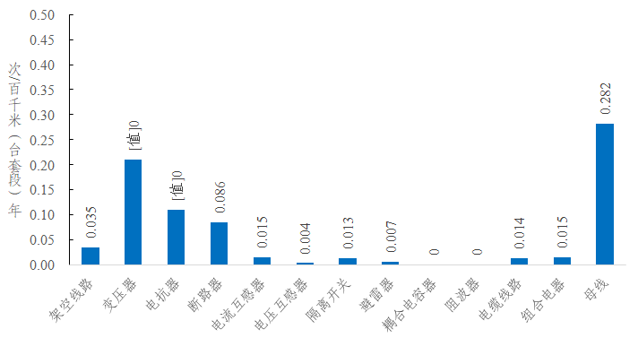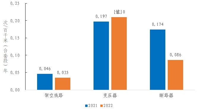 2022年,架空線路的強迫停運率為0.035次/百千米年,同比減少0.011次/百千米年。變壓器的強迫停運率為0.210次/百臺年,同比增加0.013次/百臺年。斷路器的強迫停運率為0.086次/百臺年,同比減少0.088次/百臺年。