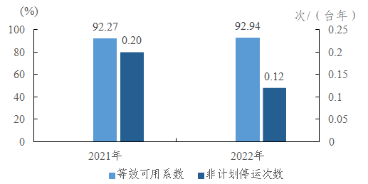 2022年輸變電設(shè)施運行可靠性指標總體位置在較高水平,十三類輸變電設(shè)施的可用系數(shù)保持在99.45%以上,強迫停運率維持在0.3次/百千米(臺、套、段)年以下。