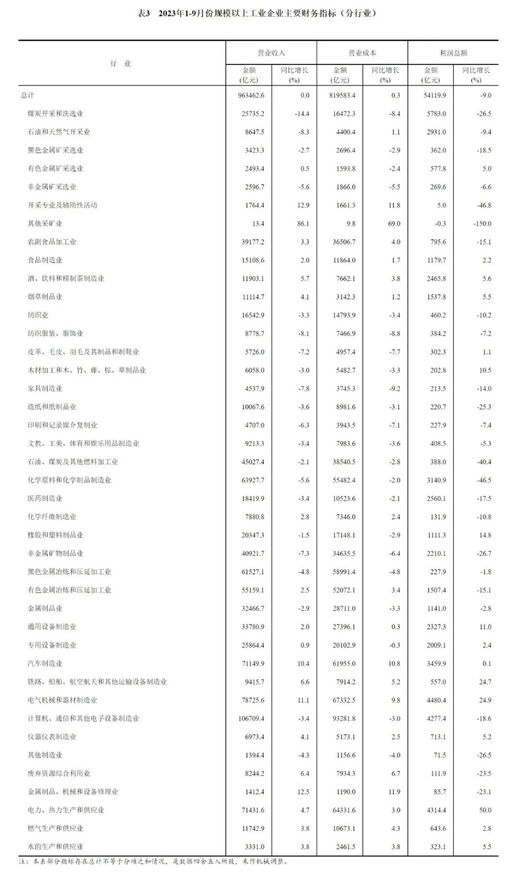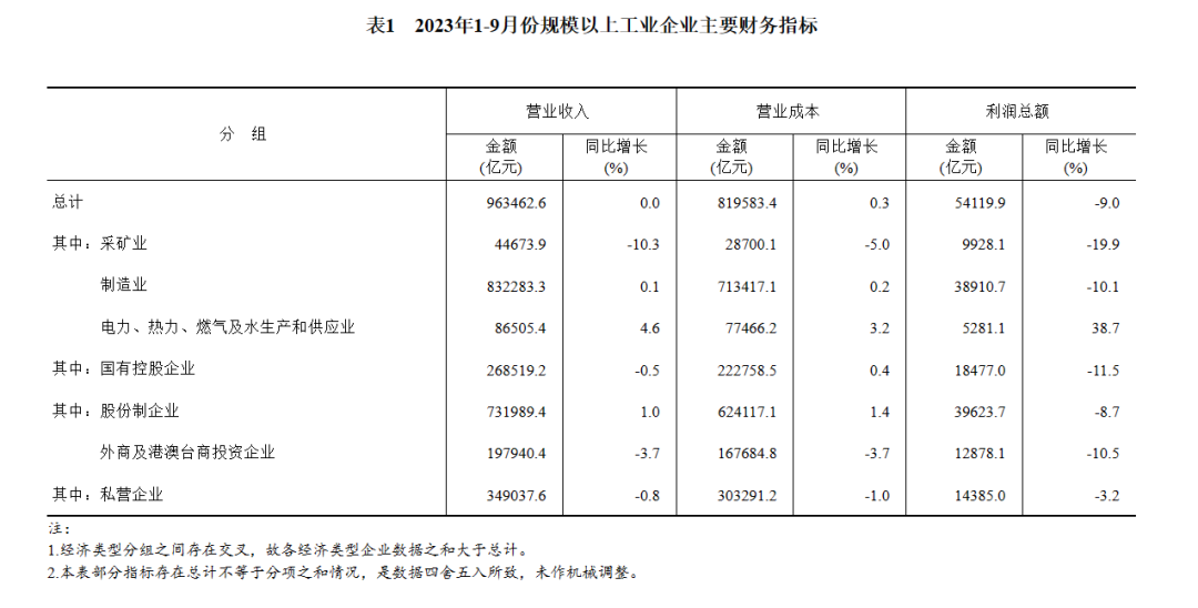 1—9月份,全國規(guī)模以上工業(yè)企業(yè)實現(xiàn)利潤總額54119.9億元,同比下降9.0%,降幅比1—8月份收窄2.7個百分點(按可比口徑計算,詳見附注二)。