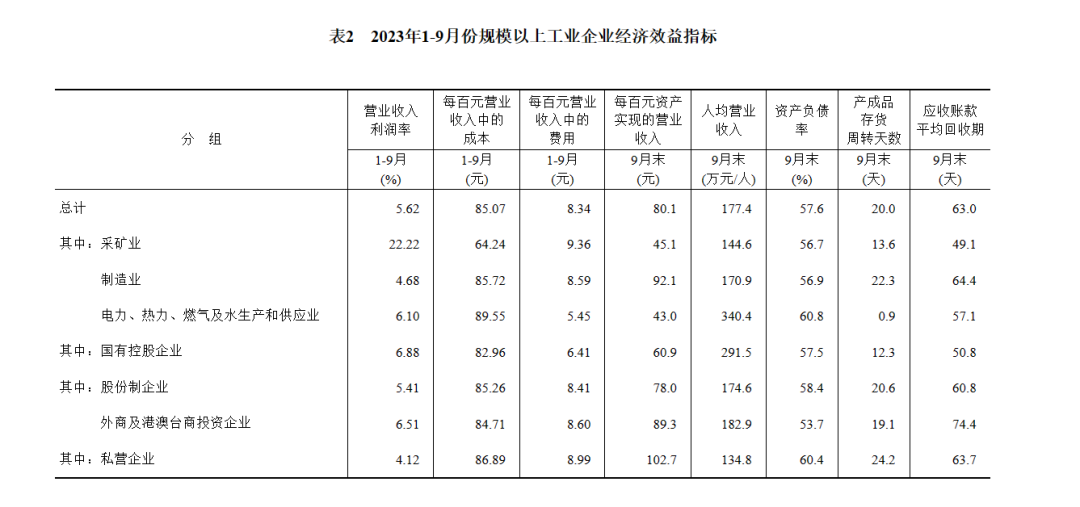 9月末,規(guī)模以上工業(yè)企業(yè)資產(chǎn)總計164.40萬億元,同比增長6.4%;負債合計94.63萬億元,增長6.7%;所有者權(quán)益合計69.77萬億元,增長6.0%;資產(chǎn)負債率為57.6%,同比上升0.2個百分點。