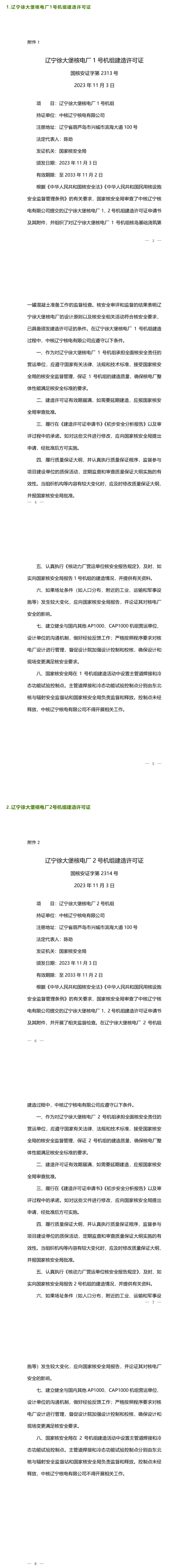 生態(tài)環(huán)境部關(guān)于頒發(fā)遼寧徐大堡核電廠1、2號(hào)機(jī)組建造許可證的通知