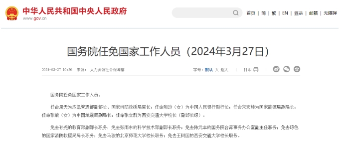 國(guó)務(wù)院任免國(guó)家工作人員。任命周天為應(yīng)急管理部副部長(zhǎng)、國(guó)家消防救援局局長(zhǎng);任命陶玲(女)為中國(guó)人民銀行副行長(zhǎng);