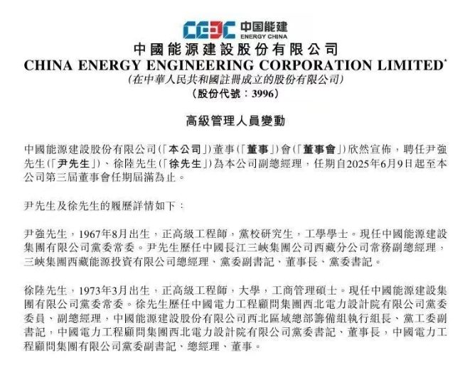 經(jīng)中國能建第三屆董事會提名委員會第十次會議審核和第三屆董事會第四十七次會議審議通過,同意聘任尹強先生、徐陸先生為公司副總經(jīng)理,任期自本次董事會批準之日起至公司第三屆董事會任期屆滿止。