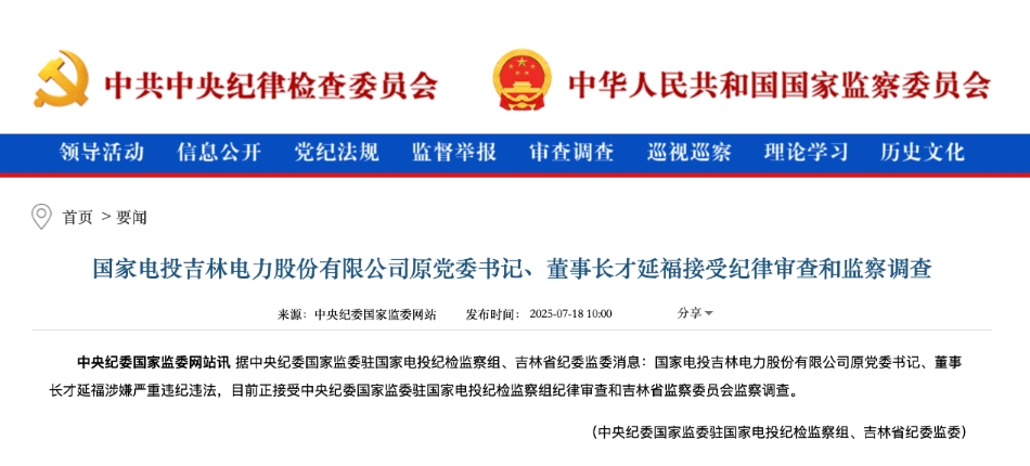 中央紀(jì)委國(guó)家監(jiān)委網(wǎng)站7月18日消息,據(jù)中央紀(jì)委國(guó)家監(jiān)委駐國(guó)家電投紀(jì)檢監(jiān)察組、吉林省紀(jì)委監(jiān)委消息:國(guó)家電投吉林電力股份有限公司原黨委書記、董事長(zhǎng)才延福涉嫌嚴(yán)重違紀(jì)違法,目前正接受中央紀(jì)委國(guó)家監(jiān)委駐國(guó)家電投紀(jì)檢監(jiān)察組紀(jì)律審查和吉林省監(jiān)察委員會(huì)監(jiān)察調(diào)查。