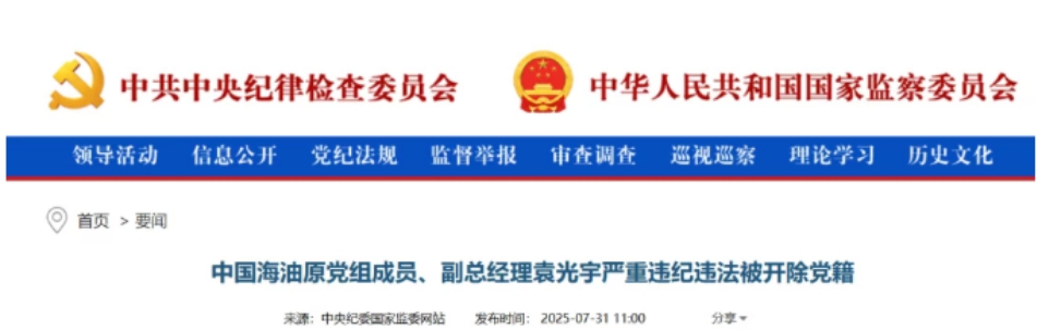 中央紀(jì)委國(guó)家監(jiān)委網(wǎng)站訊 經(jīng)中共中央批準(zhǔn),中央紀(jì)委國(guó)家監(jiān)委對(duì)中國(guó)海洋石油集團(tuán)有限公司原黨組成員、副總經(jīng)理袁光宇嚴(yán)重違紀(jì)違法問(wèn)題進(jìn)行了立案審查調(diào)查。