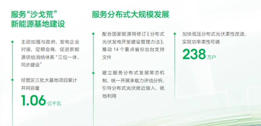 促進(jìn)新能源高質(zhì)量發(fā)展,經(jīng)營(yíng)區(qū)三批大基地項(xiàng)目累計(jì)并網(wǎng)容量1.06億千瓦;加快低壓分布式光伏柔性改造,實(shí)現(xiàn)功率柔性可調(diào)238萬(wàn)戶(hù);全年風(fēng)光新能源裝機(jī)容量新增2.7億千瓦,同比增長(zhǎng)16.5%;風(fēng)光新能源發(fā)電量占比19.3%,利用率96.1%;開(kāi)工抽水蓄能電站5座,建成投運(yùn)抽水蓄能機(jī)組23臺(tái),在運(yùn)裝機(jī)容量累計(jì)達(dá)到4056萬(wàn)千瓦;經(jīng)營(yíng)區(qū)新型儲(chǔ)能達(dá)到5876萬(wàn)千瓦。