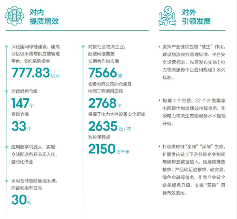 打造綠色數(shù)智供應(yīng)鏈,對(duì)內(nèi)深化國(guó)網(wǎng)綠鏈建設(shè),建成萬(wàn)億級(jí)采購(gòu)與供應(yīng)鏈管理平臺(tái),節(jié)約采購(gòu)資金777.83億元;對(duì)外構(gòu)建4個(gè)維度、22個(gè)方面國(guó)家電網(wǎng)現(xiàn)代物流績(jī)效指標(biāo)體系,引領(lǐng)電力物流生態(tài)圈服務(wù)水平提檔升級(jí)。