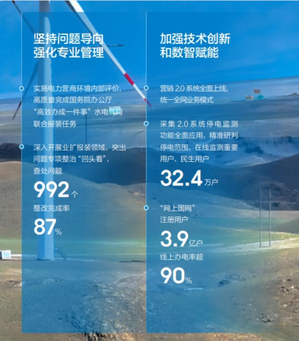 農(nóng)網(wǎng)鞏固提升工程投資1600億元,農(nóng)網(wǎng)電壓合格率99.831%,農(nóng)網(wǎng)供電可靠率99.915%;捐贈(zèng)幫扶項(xiàng)目預(yù)計(jì)年產(chǎn)值4765萬(wàn)元,帶動(dòng)群眾就近就業(yè)2100余人;投入無(wú)償幫扶資金1.1億元。
