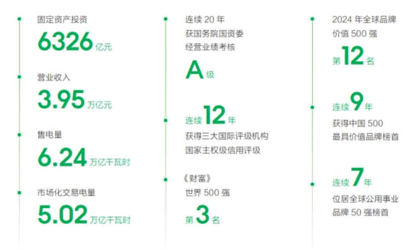 2024年完成固定資產(chǎn)投資6326億元,達(dá)成營(yíng)業(yè)收入3.95萬(wàn)億元;全年售電量6.24萬(wàn)億千瓦時(shí),市場(chǎng)化交易電量5.02萬(wàn)億千瓦時(shí);并網(wǎng)發(fā)電裝機(jī)容量26.3億千瓦,其中風(fēng)光新能源并網(wǎng)裝機(jī)容量11.4億千瓦;累計(jì)建成特高壓工程“22交16直”38項(xiàng),跨區(qū)跨省輸電能力3.4億千瓦,建成全球技術(shù)水平最高、配置資源能力最強(qiáng)、并網(wǎng)裝機(jī)規(guī)模最大、安全運(yùn)行時(shí)間最長(zhǎng)的交直流混聯(lián)特大型電網(wǎng)。