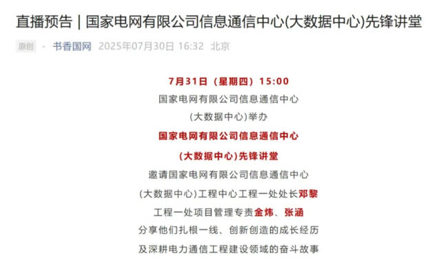 7月30日《書香國網(wǎng)》公眾號先鋒講堂直播預(yù)告推文顯示,國家電網(wǎng)有限公司信息通信中心(大數(shù)據(jù)中心)這一機構(gòu)名稱首次出現(xiàn)。