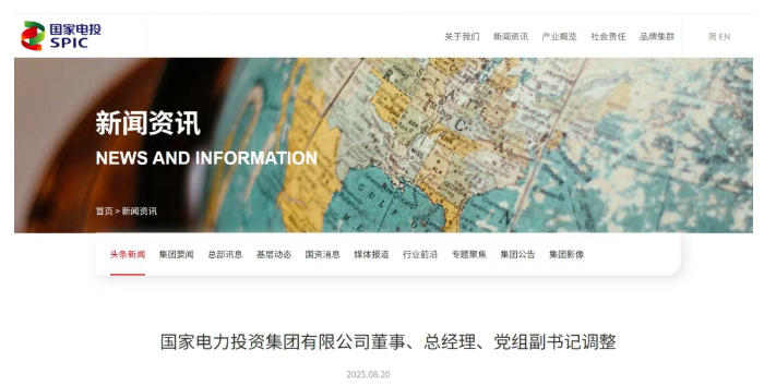 2025年8月20日,國家電力投資集團有限公司召開領(lǐng)導(dǎo)班子(擴大)會議。受中央組織部領(lǐng)導(dǎo)委托,中央組織部有關(guān)干部局負責(zé)同志宣布了黨中央關(guān)于國家電力投資集團有限公司總經(jīng)理調(diào)整的決定:
