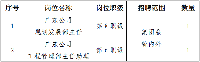 根據(jù)工作需要,依據(jù)公司招聘管理相關(guān)規(guī)定,現(xiàn)對(duì)廣東公司(海外公司)規(guī)劃發(fā)展部主任等兩個(gè)崗位進(jìn)行公開(kāi)招聘。