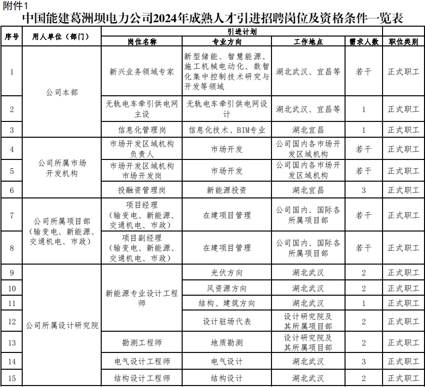 崗位詳細(xì)信息請(qǐng)點(diǎn)擊文末“閱讀原文”查看《中國(guó)能建葛洲壩電力公司2024年成熟人才引進(jìn)招聘崗位及資格條件一覽表》(附件1)。