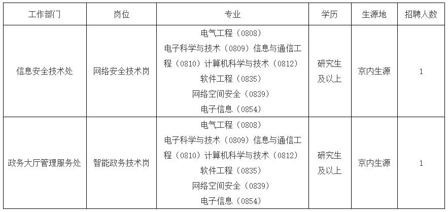2.政務(wù)大廳管理服務(wù)處:智能政務(wù)技術(shù)崗工作人員1名(京內(nèi)生源研究生及以上應(yīng)屆畢業(yè)生)。專業(yè)為電氣工程(0808)、電子科學(xué)與技術(shù)(0809)、信息與通信工程(0810)、計算機(jī)科學(xué)與技術(shù)(0812)、軟件工程(0835)、網(wǎng)絡(luò)空間安全(0839)、電子信息(0854)。要求作風(fēng)正派、嚴(yán)謹(jǐn)細(xì)致、踏實(shí)肯干,責(zé)任心強(qiáng)、執(zhí)行力強(qiáng)、服務(wù)意識強(qiáng),具有較強(qiáng)的溝通協(xié)調(diào)能力和文字功底。
