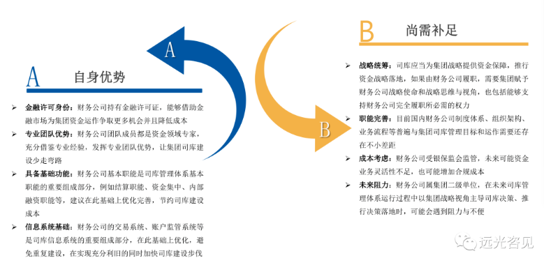 有不少企業(yè)會(huì)有困惑,是否可以以財(cái)務(wù)公司為基礎(chǔ)構(gòu)建司庫(kù)管理體系?這個(gè)不建議直接用“是\否”來回答,或許回答“部分可以”會(huì)比較適宜。從財(cái)務(wù)公司優(yōu)勢(shì)和可能存在的不足兩個(gè)角度進(jìn)行簡(jiǎn)要分析,如圖: