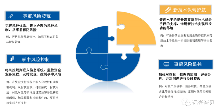 從信息化落地角度加強(qiáng)資金業(yè)務(wù)全面監(jiān)控,建議從四個(gè)維度展開:事前風(fēng)險(xiǎn)防范、事中風(fēng)險(xiǎn)控制、事后風(fēng)險(xiǎn)監(jiān)控、新技術(shù)保駕護(hù)航。