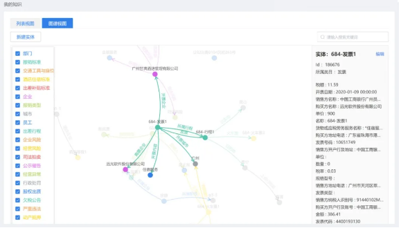 通過遠光軟件“知識圖譜應(yīng)用平臺”的圖譜構(gòu)建模塊,可以將審單過程中需要用到的各種實體融合到一張圖中,非常直觀的定義各類實體間的關(guān)系。再通過RPA或外部系統(tǒng)提供的數(shù)據(jù)接口,將實體所對應(yīng)的具體數(shù)據(jù)導(dǎo)入,從而形成我們審單所需要的各類知識。單據(jù)中包含了哪些信息,哪些需要被重點關(guān)注,在圖中一目了然,真正做到了“哪里不清楚點哪里”。最后,將審單規(guī)則配置到圖譜中,就可以實現(xiàn)報銷單的自動審核。