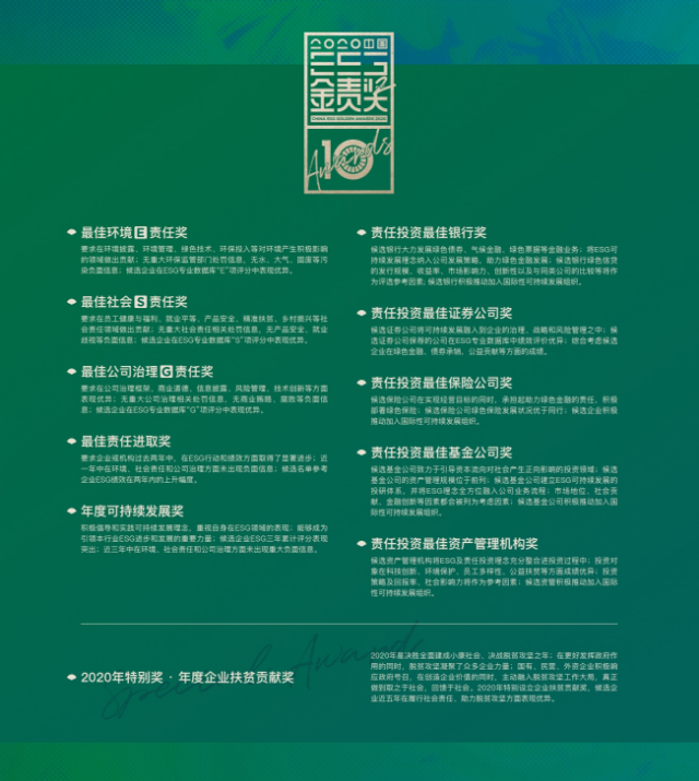 本次評選設(shè)置有最佳環(huán)境(E)責(zé)任獎(jiǎng)、最佳社會(S)責(zé)任獎(jiǎng)、最佳公司治理(G)責(zé)任獎(jiǎng)、最佳責(zé)任進(jìn)取獎(jiǎng)、年度可持續(xù)發(fā)展獎(jiǎng)、責(zé)任投資最佳銀行獎(jiǎng)、責(zé)任投資最佳證券公司獎(jiǎng)、責(zé)任投資最佳保險(xiǎn)公司獎(jiǎng)、責(zé)任投資最佳基金公司獎(jiǎng)、責(zé)任投資最佳資產(chǎn)管理機(jī)構(gòu)獎(jiǎng)十個(gè)大獎(jiǎng)。此外,2020年是決勝全面建成小康社會、決戰(zhàn)脫貧攻堅(jiān)之年,評選特別增設(shè)企業(yè)扶貧貢獻(xiàn)獎(jiǎng)。獎(jiǎng)項(xiàng)候選名單是基于企業(yè)公開信息、新聞輿情等資料及權(quán)威數(shù)據(jù)庫綜合評估后所得。