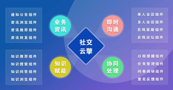 遠(yuǎn)光社交云擎套件,含即時(shí)溝通、知識(shí)賦能、業(yè)務(wù)資訊、協(xié)同處理四大云擎組件,所有組件能夠與企業(yè)各類(lèi)業(yè)務(wù)系統(tǒng)深度融合,以人為核心,以高效協(xié)同為根本,改變企業(yè)及組織傳統(tǒng)的互動(dòng)與信息共享方式,破解業(yè)務(wù)協(xié)同互聯(lián)等難題,實(shí)現(xiàn)管理系統(tǒng)融合創(chuàng)新,助力管理快速社交化、智能化升級(jí)。