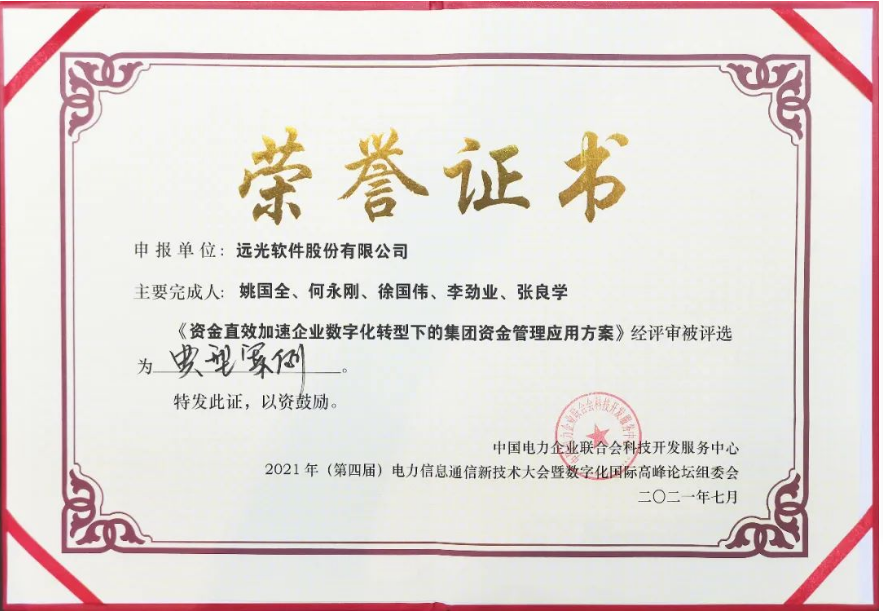大會(huì)同期召開(kāi)電力企業(yè)數(shù)字化轉(zhuǎn)型案例終審評(píng)審會(huì),并在會(huì)上公布最終獲選的優(yōu)秀案例和典型案例名單。本次案例征集活動(dòng)致力于協(xié)同推進(jìn)電力行業(yè)數(shù)字化轉(zhuǎn)型和數(shù)字產(chǎn)業(yè)化發(fā)展,展示企業(yè)數(shù)字化轉(zhuǎn)型背景下的電力行業(yè)最新成果。遠(yuǎn)光軟件自主研發(fā)的“資金直效加速企業(yè)數(shù)字化轉(zhuǎn)型下的集團(tuán)資金管理應(yīng)用方案”、協(xié)助支持的客戶項(xiàng)目“智慧財(cái)務(wù)經(jīng)營(yíng)大數(shù)據(jù)分析應(yīng)用”、“電力智慧共享財(cái)務(wù)管理平臺(tái)”,憑借新技術(shù)應(yīng)用和顯著的應(yīng)用價(jià)值,皆入選為“典型案例”。