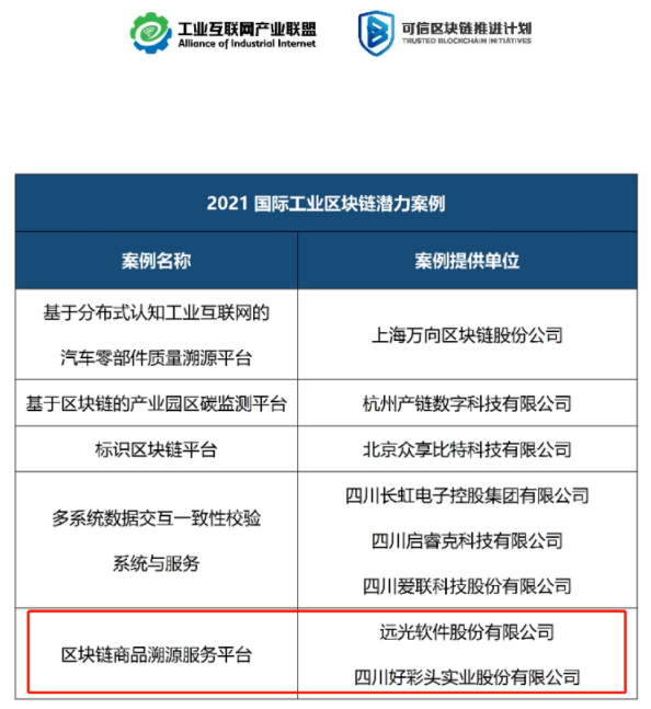 近日,由湖南省工業(yè)和信息化廳主辦的2021國(guó)際工業(yè)區(qū)塊鏈大會(huì)在長(zhǎng)沙順利召開,會(huì)上發(fā)布了《2021工業(yè)區(qū)塊鏈案例集》、《工業(yè)區(qū)塊鏈應(yīng)用指南》、《2021工業(yè)區(qū)塊鏈技術(shù)應(yīng)用及趨勢(shì)報(bào)告》等重磅成果。憑借在區(qū)塊鏈領(lǐng)域的創(chuàng)新技術(shù)能力及應(yīng)用成果,遠(yuǎn)光軟件區(qū)塊鏈商品溯源服務(wù)平臺(tái)成功入選《2021工業(yè)區(qū)塊鏈案例集》。