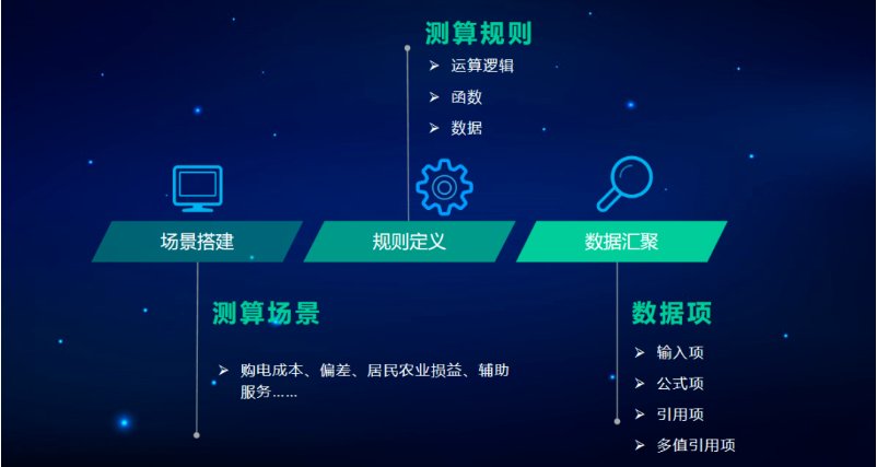 系統(tǒng)擁有龐大的數(shù)據(jù)項(xiàng)庫、函數(shù)庫與邏輯庫,在應(yīng)用層面可以根據(jù)不同省份的實(shí)際情況,靈活配置,快速形成對(duì)應(yīng)的測(cè)算規(guī)則體系。數(shù)據(jù)項(xiàng)和規(guī)則在不同的測(cè)算場(chǎng)景中集合,以“代理購(gòu)電用戶測(cè)算”、“偏差測(cè)算”、“購(gòu)電成本測(cè)算”、“居民農(nóng)業(yè)損益測(cè)算”等場(chǎng)景,構(gòu)成一整套或多套代理購(gòu)電測(cè)算引用模型。每個(gè)場(chǎng)景相互呼應(yīng)、縝密配合、嚴(yán)謹(jǐn)規(guī)范,形成了代理購(gòu)電測(cè)算的整個(gè)體系。