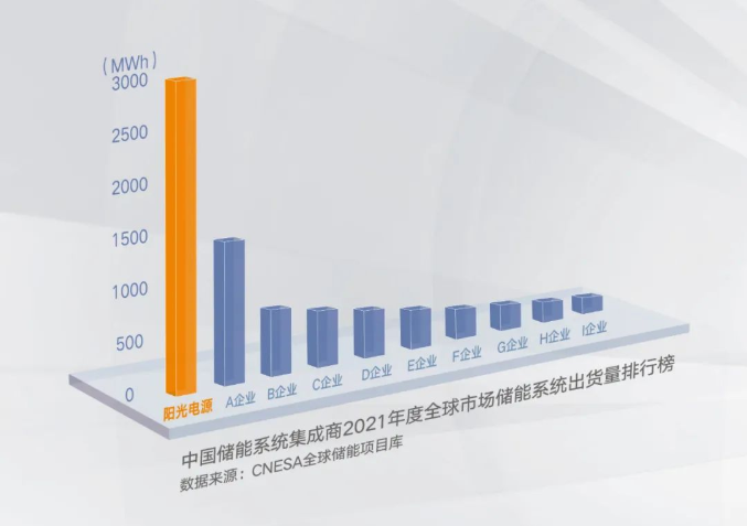 本次排名以全球儲(chǔ)能項(xiàng)目庫為依據(jù),對(duì)中國主流儲(chǔ)能系統(tǒng)供應(yīng)商發(fā)貨量進(jìn)行研究,陽光電源憑借2021年儲(chǔ)能系統(tǒng)全球發(fā)貨3GWh、儲(chǔ)能變流器全球發(fā)貨2.5GW,再次贏得雙項(xiàng)第一。
