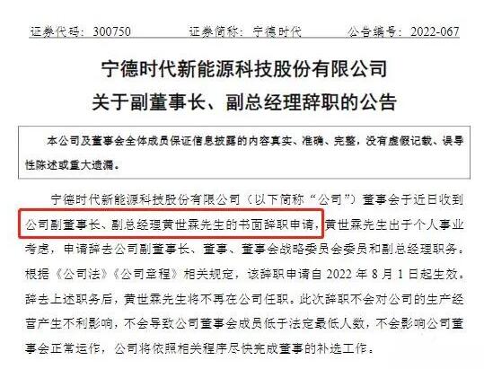 8月1日晚間,寧德時(shí)代披露公告稱,公司董事會(huì)于近日收到公司副董事長(zhǎng)、副總經(jīng)理黃世霖的書面辭職申請(qǐng),黃世霖出于個(gè)人事業(yè)考慮,申請(qǐng)辭去公司副董事長(zhǎng)、董事、董事會(huì)戰(zhàn)略委員會(huì)委員和副總經(jīng)理職務(wù)。辭去上述職務(wù)后,黃世霖將不再在公司任職。