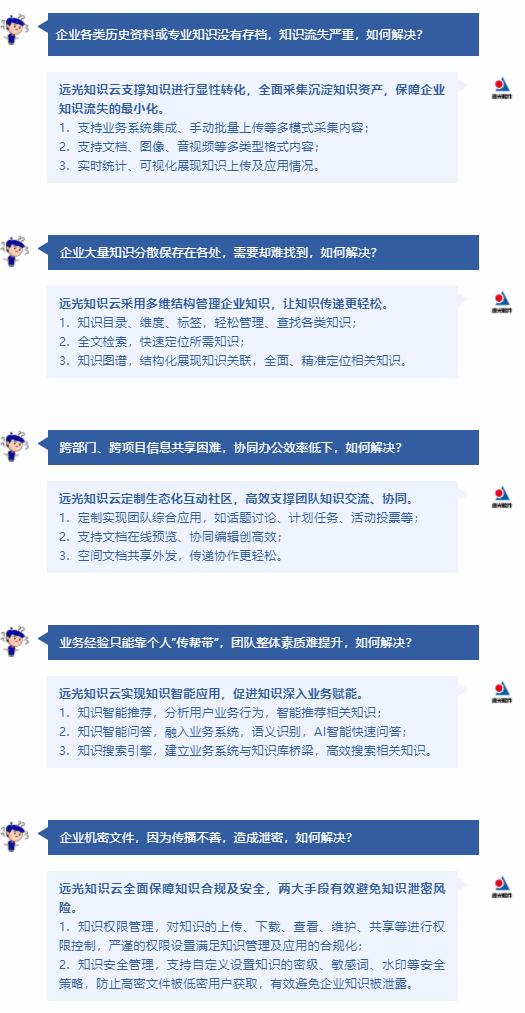 對(duì)于企業(yè)知識(shí)管理場(chǎng)景中常見的難題,遠(yuǎn)光知識(shí)云提供以下解決方案,全面支撐企業(yè)知識(shí)高效、安全管理與應(yīng)用。