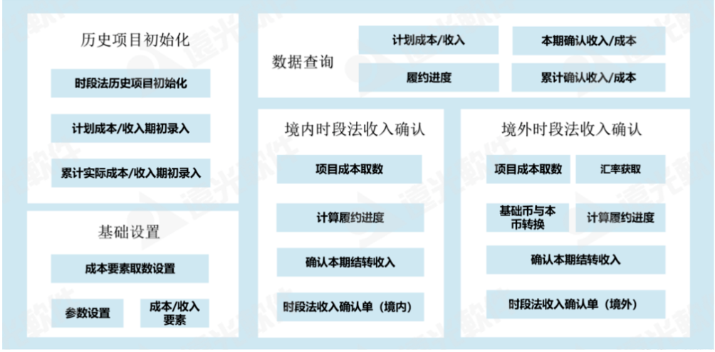 時(shí)段法收入核算系統(tǒng)包括“歷史項(xiàng)目初始化”、“基礎(chǔ)設(shè)置”、“境內(nèi)時(shí)段法收入確認(rèn)”、“境外時(shí)段法收入確認(rèn)”和“數(shù)據(jù)查詢”五個(gè)模塊,詳細(xì)見以下圖所示。