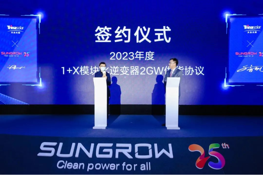 天合智慧能源許凌女士在簽約現(xiàn)場表示:“與陽光電源一樣,天合光能今年也25歲了,雙方一起在光伏行業(yè)砥礪前行,都取得了長足的發(fā)展。多年來,我們見證陽光電源始終保持著蓬勃的創(chuàng)新活力和高質量的產(chǎn)品輸出。這次與陽光電源簽訂了2GW的‘1+X’模塊化逆變器供貨協(xié)議,期待用陽光的逆變新品,打造出更好的光伏電站。”