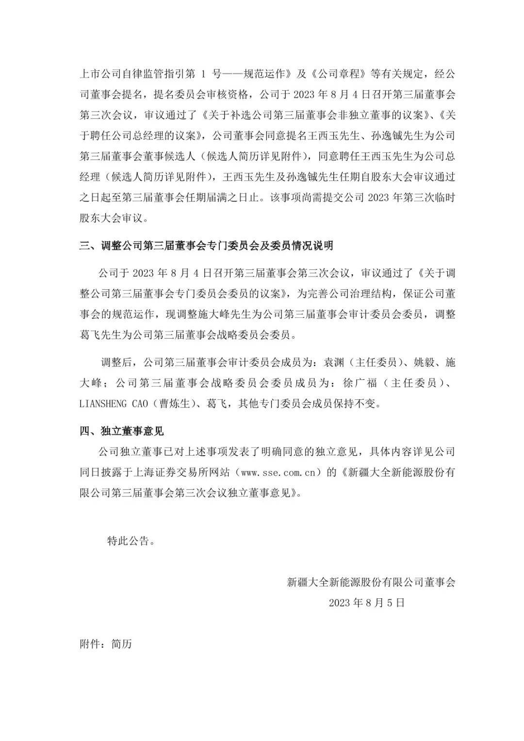 此外,公司董事會(huì)同意提名王西玉、孫逸鋮為公司第三屆董事會(huì)董事候選人,同意聘任王西玉為公司總經(jīng)理,王西玉及孫逸鋮任期自股東大會(huì)審議通過(guò)之日起至第三屆董事會(huì)任期屆滿之日止。該事項(xiàng)尚需提交公司2023年第三次臨時(shí)股東大會(huì)審議。