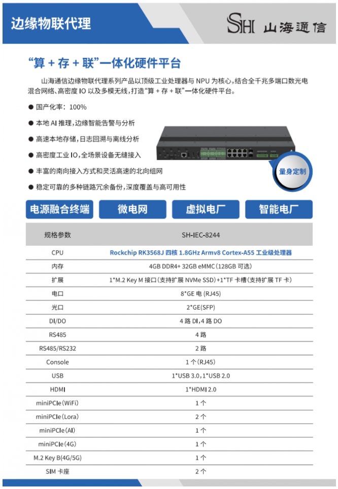 山海通信邊緣物聯(lián)代理系列產(chǎn)品以頂級(jí)工業(yè)處理器與 NPU為核心,結(jié)合全千兆多端口數(shù)光電混合網(wǎng)絡(luò)、高密度IO以及多模無線,打造“算+存+聯(lián)”一體化硬件平臺(tái)。