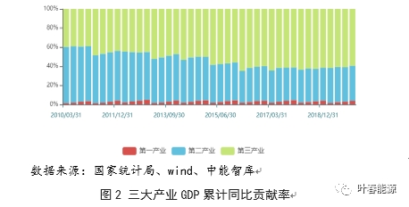 分產(chǎn)業(yè)看,10余年來,隨著我國經(jīng)濟結(jié)構(gòu)的轉(zhuǎn)型,三大產(chǎn)業(yè)對GDP的貢獻率發(fā)生明顯變化。2010至2019年,第三產(chǎn)業(yè)GDP貢獻率由39.7%上升至59.4%,增加接近20個百分點;第二產(chǎn)業(yè)GDP貢獻率由58.6%降至36.8%,下降21.8個百分點。三大產(chǎn)業(yè)貢獻率格局基本穩(wěn)定,第三產(chǎn)業(yè)成為拉動GDP的生力軍,其占比上升5.7個百分點;二產(chǎn)占比下降6.6個百分點。2019年,第三產(chǎn)業(yè)和城鄉(xiāng)居民生活用電量對全社會用電量增長的貢獻率達51.0%,比上年提高11.1個百分點,其中第三產(chǎn)業(yè)貢獻率比上年提高10.1個百分點,是支撐全社會用電量增長的主要動力。