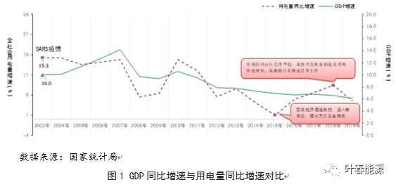 用電量與GDP增速具有較強的相關(guān)性。從GDP與用電量增速對比曲線圖可以看出,2003-2019年二者用電量走勢基本一致。2015年和2018年二者有些背離,一方面是經(jīng)濟增速進入換擋期,動力轉(zhuǎn)換;另一方面是二者統(tǒng)計指標調(diào)整時間上有些不一致。