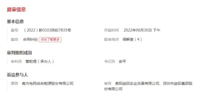 6月28日,深圳市益田集團(tuán)股份有限公司新增開庭公告,開庭時(shí)間為2022年06月30日 15:00,案號(hào)為(2022)黔0103民初7835號(hào),案由系合同糾紛,上訴人/原告為南方電網(wǎng)綜合能源股份有限公司,被上訴人/被告為貴陽(yáng)益田實(shí)業(yè)發(fā)展有限公司,深圳市益田集團(tuán)股份有限公司,法院為貴州省貴陽(yáng)市云巖區(qū)人民法院。