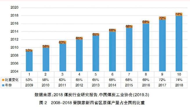 在供給側結構性改革政策的推動下,煤炭產能集中度進一步提高。十八大以來,國務院相繼出臺了關于深化煤炭市場化改革的一系列文件,增大了煤炭去產能力度,截至到2018年底,基本上提前完成了“十三五”煤炭去產能8億噸的計劃,淘汰關閉了一大批不合標準的煤礦。同時,為了滿足日益增長的能源市場需要,新建、擴建、技改一批現(xiàn)代化礦井,產能已達到14.96億噸。據(jù)中國煤炭工業(yè)協(xié)會統(tǒng)計,全國煤礦數(shù)量從2015年的1.08萬處減少到目前的5800處,年產能120萬噸及以上的大型煤礦產量超過80%,年產能30萬噸及以下小型煤礦減少至10%以下。煤炭開采向大型煤炭基地集中,其產量占全國總產量的95%以上,5000萬噸級以上大型礦井產量占60%以上。煤炭生產布局進一步向晉、陜、蒙、新地區(qū)等地區(qū)集中。2018年,內蒙古、山西、陜西、新疆、貴州、山東、河南、安徽等8個億噸級規(guī)模以上企業(yè)原煤產量達31.2億噸,占全國的88.1%,其中,晉、陜、蒙、新四省(區(qū))原煤產量占全國的74.3%。見圖1、圖2。
