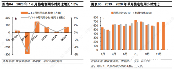 直至9月,年內(nèi)第一臺(tái)新投產(chǎn)機(jī)組田灣 5 號(hào)才實(shí)現(xiàn)商運(yùn)。全國核電運(yùn)行狀況持續(xù)向好,利用小時(shí)節(jié)節(jié)攀升,前三季度累計(jì)利用小時(shí)連續(xù)第四年實(shí)現(xiàn)增長。觀察單月的利用小時(shí)情況,除了 7、8、10三個(gè)月受創(chuàng)紀(jì)錄來水帶來的水電強(qiáng)勢(shì)壓制外,僅有 1、2 月受疫情影響導(dǎo)致利用小時(shí)低于上年同期。但從下降幅度來看,1-2月水、火、風(fēng)利用小時(shí)降幅均超過 10%,而核電同比下降不到 7%,穩(wěn)健性凸顯無疑。