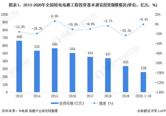 受到福島核電站等事故的影響,我國核電建設(shè)雖然處在高速發(fā)展期,但是保持著以“穩(wěn)”為主的基調(diào),新開工機組數(shù)量較少,核電工程投資額有所下滑。根據(jù)中國電力企業(yè)聯(lián)合會的統(tǒng)計數(shù)據(jù)顯示,2020年1-10月,全國主要核電企業(yè)電源工程完成投資259億元,同比下降0.4%。