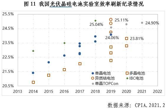實驗室方面,2020年4月,晶科研發(fā)的多晶硅(Multicrystalline)電池片實驗室效率達到23.3%,并被收錄于NREL電池片轉換效率紀錄表中,隨后阿特斯宣布將該效率提高至23.81%。7月,晶科宣布其研發(fā)的N型單晶硅單結電池片效率達到24.79%,2021年1月,將該紀錄再次刷新到24.90%,創(chuàng)造了新的大面積N型單晶鈍化接觸電池片效率世界紀錄。我國除了在晶硅電池技術方面領先全球外,鈣鈦礦、有機電池等電池片實驗室效率也走在世界前列,2020年7月,杭州纖納光電以18.04%的鈣鈦礦小組件光電轉換效率的成績,第七次蟬聯了鈣鈦礦小組件世界紀錄榜首。目前NREL電池片轉換效率紀錄表中,除晶科的多晶硅電池片外,上海交大/北航、中科院化學所和漢能分別研發(fā)的有機電池、有機疊層電池和薄膜電池仍保持著世界紀錄。