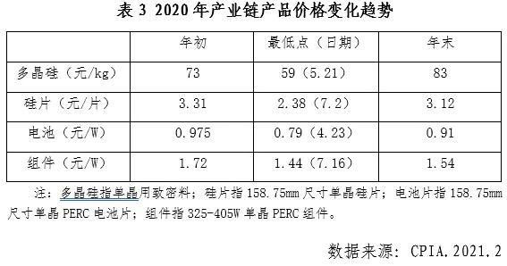 (四)產業(yè)鏈供給矛盾突出2020年,光伏產品價格經歷了V字型起伏的過程,光伏產業(yè)硅料、玻璃和EVA膠膜等部分原輔材料環(huán)節(jié)出現的供需緊張也前所未有。上半年,受全球疫情蔓延影響,對下游應用市場未來需求的不確定性導致產業(yè)鏈大幅降價,各環(huán)節(jié)價格降幅均在20%左右。硅料環(huán)節(jié),三季度受到事故及自然災害等因素影響供應緊張,8月多晶硅致密料價格由6月的59元/公斤增加至約95元/公斤,漲幅約為60%;四季度隨著新疆地區(qū)硅料企業(yè)復工,多晶硅價格回落,但仍高于二季度價格低點38%。EVA膠膜的生產設備及原材料EVA粒子可用于防疫物資生產,2020年防疫物資需求暴漲,使得生產設備及EVA粒子供應緊張,膠膜企業(yè)擴產受阻延遲,在下半年需求暴漲的情況下,EVA膠膜企業(yè)只能通過大幅漲價的方式來獲取EVA粒子資源。下半年EVA膠膜價格上漲了50%,一度達到14元/平方米的高價,和POE膠膜的價格形成了倒掛。下半年需求的集中爆發(fā)導致光伏玻璃供給出現巨大缺口,價格快速上漲,年底3.2mm光伏玻璃價格達到了43元/平方米,較5-6月最低時上漲80%,部分企業(yè)采用浮法玻璃作為雙面組件的背板玻璃。進入12月,產品價格趨于平緩。但全年來看,除多晶硅價格上漲13.7%以外,硅片、電池、組件產品價格仍分別下降了5.7%、6.7%與10.5%,降本增效發(fā)展方向沒有變,長期來看價格依然是下降趨勢。