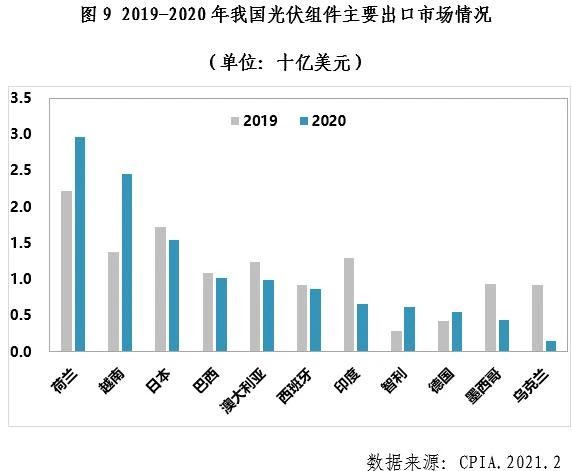 從光伏組件出口市場來看,2020年光伏組件主要出口市場中傳統(tǒng)市場活力不減,其中荷蘭和越南市場份額增長明顯。在光伏發(fā)電成本持續(xù)降低以及歐盟綠色協議的背景下,歐洲市場保持增長勢頭,荷蘭作為歐洲市場的集散中心出口量持續(xù)增長。越南新一輪FIT政策引發(fā)了越南屋頂光伏的搶裝熱潮,根據越南工貿部的公告顯示,2020年越南光伏新增裝機為10.75GW,成為全球前3大光伏市場,其中屋頂光伏裝機超過9GW。越南市場新增裝機猛增,對我國組件需求明顯增長,成為第二大光伏組件出口市場。印度市場受疫情影響,市場需求下降較為明顯。曾經的新興市場烏克蘭因其國內電價的下降致使光伏項目的收益有所降低,投資熱情減退,市場需求下降。墨西哥市場受到清潔能源拍賣的取消以及后續(xù)政策不確定性的影響未能延續(xù)之前的增長勢頭,市場需求有所下降。