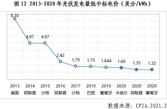 (五)光伏發(fā)電電價與成本持續(xù)下降2020年,全球光伏發(fā)電中標電價繼續(xù)下降,僅一年中全球就有三個項目接連創(chuàng)造了最低中標電價。8月,位于葡萄牙一光伏項目中標電價達到了0.0112歐元/kWh(約1.32美分/kWh),折合當時人民幣價格約0.091元/kWh。這一電價比2019年最低中標電價降低了0.324美分/kWh,降幅達到19.7%。2020年,我國光伏發(fā)電項目中標電價也刷新最低紀錄,青海海南州一光伏發(fā)電競價項目中標電價為0.2427元/kWh(約3.46美分/kWh),低于2019年達拉特旗光伏項目0.26元/kWh的電價。除此之外,卡塔爾、阿聯酋、印度等國光伏中標電價也打破了原來的最低紀錄。光伏發(fā)電價格已經在全球越來越多的國家及地區(qū)低于火電,成為了最具競爭力的電力產品。