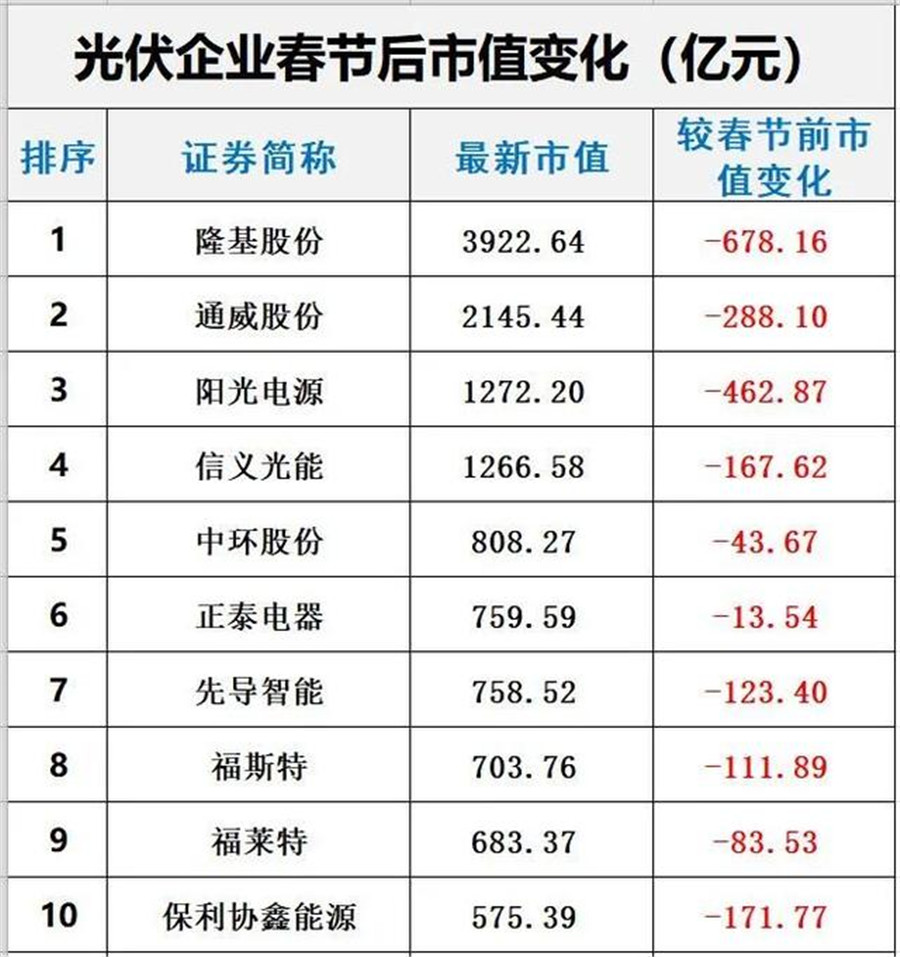 其中隆基股份總市值較春節(jié)前下跌678億、通威股份下跌288億、陽光電源跌去462億、信義光能下跌167億、中環(huán)股份下跌43億、正泰電器跌去13億、先導智能跌去123億、福斯特跌去111億、福萊特跌去83億、保利協(xié)鑫能源跌去171億、晶澳科技跌去97億。