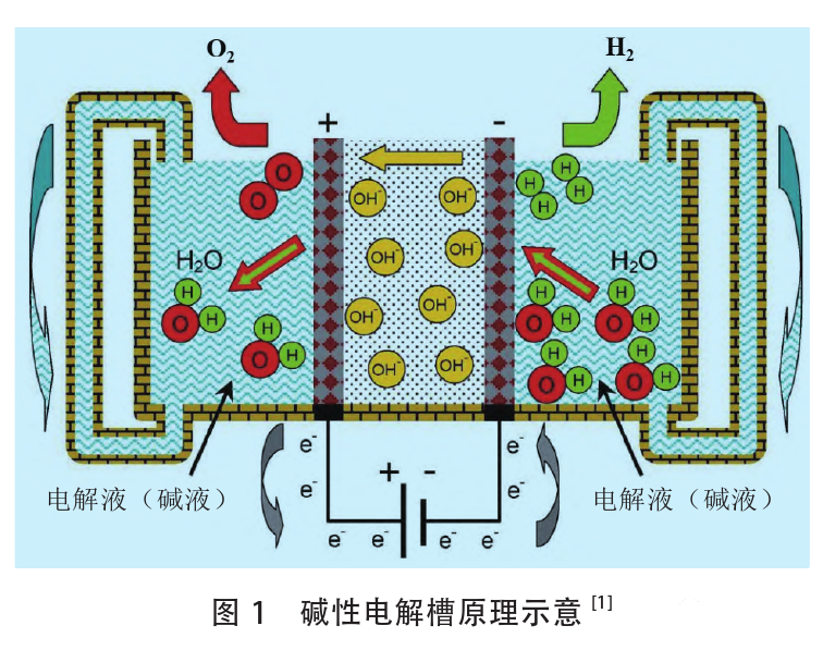 堿性電解槽的工作原理如圖1所示。電池由兩個電極組成,兩個電極由氣密隔膜分開。電池裝配時浸沒在高濃度的堿性液體電解質(zhì)KOH(20%~30%)中,使離子電導(dǎo)率最大化,NaOH和NaCl溶液也可作電解液,但不常用,電解液的主要缺點是具有腐蝕性。電解槽的工作溫度為65~100℃,電解槽陰極產(chǎn)生氫氣,生成的OH–通過隔膜流向陽極,在陽極表面重新結(jié)合產(chǎn)生氧氣。先進(jìn)的堿性電解槽適合大規(guī)模制氫,一些制造商制造的堿性電解槽在(500~760Nm3/h)具有非常高的產(chǎn)氫能力,相應(yīng)的耗電量為2150~3534kW。