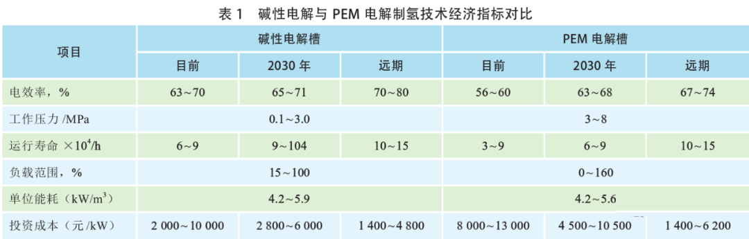 我國以可再生能源(如風(fēng)電、光伏、水電)進(jìn)行電解水制氫,電價控制在0.25元/kWh以下時,制氫成本具有相對經(jīng)濟(jì)性(15.3~20.9元/kg)。堿性電解與PEM電解制氫技術(shù)經(jīng)濟(jì)指標(biāo)見表1。