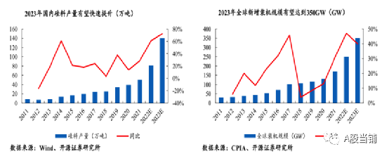隨著硅料價格回落,全球景氣市場(國內(nèi)分布式、歐洲市場)有望保持快速增長,部分被抑制需求(國內(nèi)集中式、亞太市場、中東非市場)也有望釋放,疊加美國政策邊際放松有望帶來裝機(jī)規(guī)??焖偬嵘?, 預(yù)計2023年全球新增裝機(jī)規(guī)模將達(dá)到350GW。